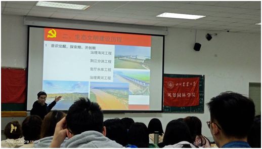 在本次党课上,刘维东老师围绕中国生态文明建设历程展开,从意识觉醒、进入探索和开创期到立法完善期,再从可持续发展理念与国际接轨期到生态文明建设理念确立期,最后进入生态文明新时代。刘老师谈到,从新中国成立初期到新世纪新阶段,以毛泽东、邓小平、江泽民、胡锦涛、习近平为代表的党中央领导人十分重视生态文明建设,进而推动了生态文明建设的发展历程。刘老师强调:在这段建设历程中,中国共产党始终是环境保护和生态文明建设事业的领导力量,领导人民建设社会主义生态文明,树立“退耕还林,封山绿化”、“绿水青山就是金山银山”和可持续发展等生态文明理念。