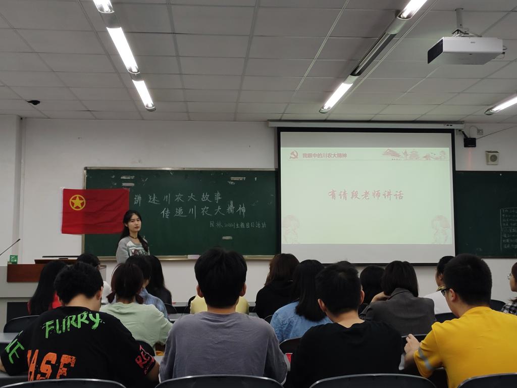 团日活动在同学们齐唱《共青团团歌》的嘹亮歌声中拉开序幕。随后,由段晓宇老师上台分享“我眼中的川农大精神”。段老师本科毕业于川农大,又先后在川农大顺利拿到硕士、博士学位,2017她作为城市森林生态专业访问学者到英属哥伦比亚大学林学院进修,回国后又留在川农大就职,现今担任园林201801班的班主任。她向同学们讲述了她在川农大学习期间的故事,讲述她以及身边的老师、同学如何在艰苦的条件下刻苦钻研学习,克服重重困难后继续拼搏。当谈到其访学归国回到川农大的经历时,她表示:“我很确信我会回来,我对这里有感情了。”