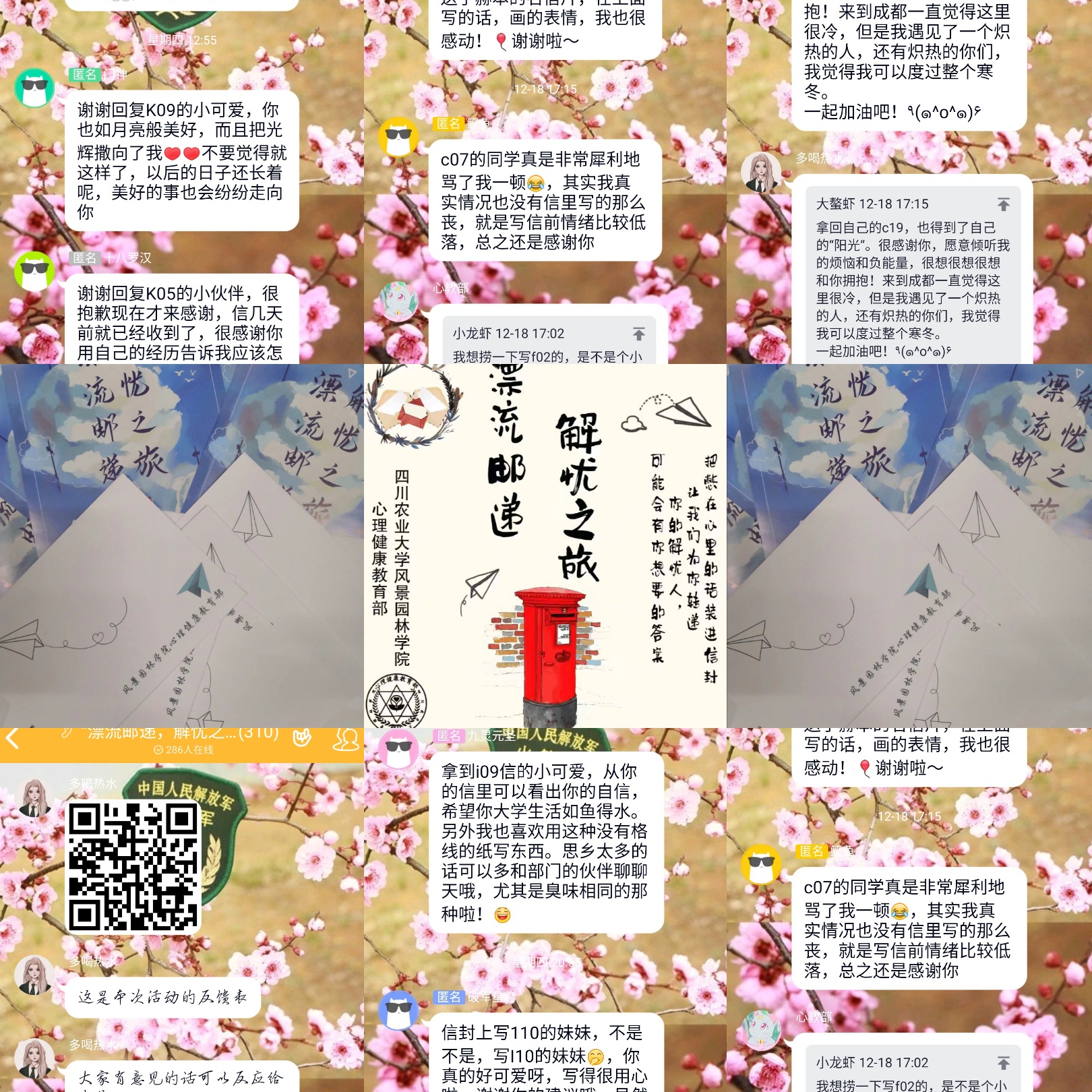 此次活动的对象面向成都校区的所有同学,参与方式也很简单。最大亮点在于投递采用电子档并且为匿名的方式,而回信则采用纸质版的手写回信,整个过程参与者的信息都是处于保密状态,这样的方式能让收信人更加真实地感受到答复中的真诚。不仅如此,活动交流群也很独特。群里没有人说任何消极且不健康的话,大家的发言皆是感谢或道歉之类的语句。有人感谢回信的人,有人感谢心教部工作人员,有人为自己没有给收信的人问好而道歉,有人还为自己回信得不好而道歉。生活中,有时候陌生人的关心更让人感受到温暖,心教部的同学表示:望所有同学在这满目繁花、亦有风霜的人生路上,都能找到排解烦忧的方式并收获成长。