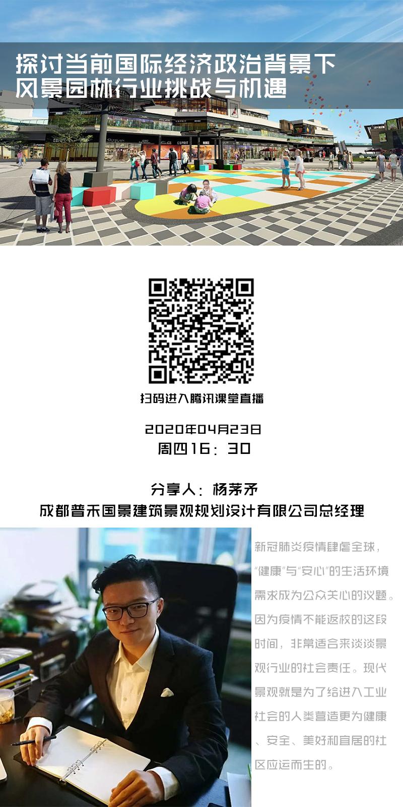 4月23日,为丰富线上教学内容,培养学生对行业发展的认知,对未来发展的格局,拓宽学生眼界,辨清时代趋势,了解行业动向,包子漫画 园林17级1班、环境设计18级3班全体同学在班主任王丽萍的带领下聆听了名为“探讨当前国际经济政治背景下,风景园林行业挑战与机遇”的线上分享会。学院“行业菁英俱乐部”常务理事、学院校外导师、校外班主任、普禾国景景观设计有限公司董事长杨茅矛先生受邀与同学们进行线上的交流与分享。