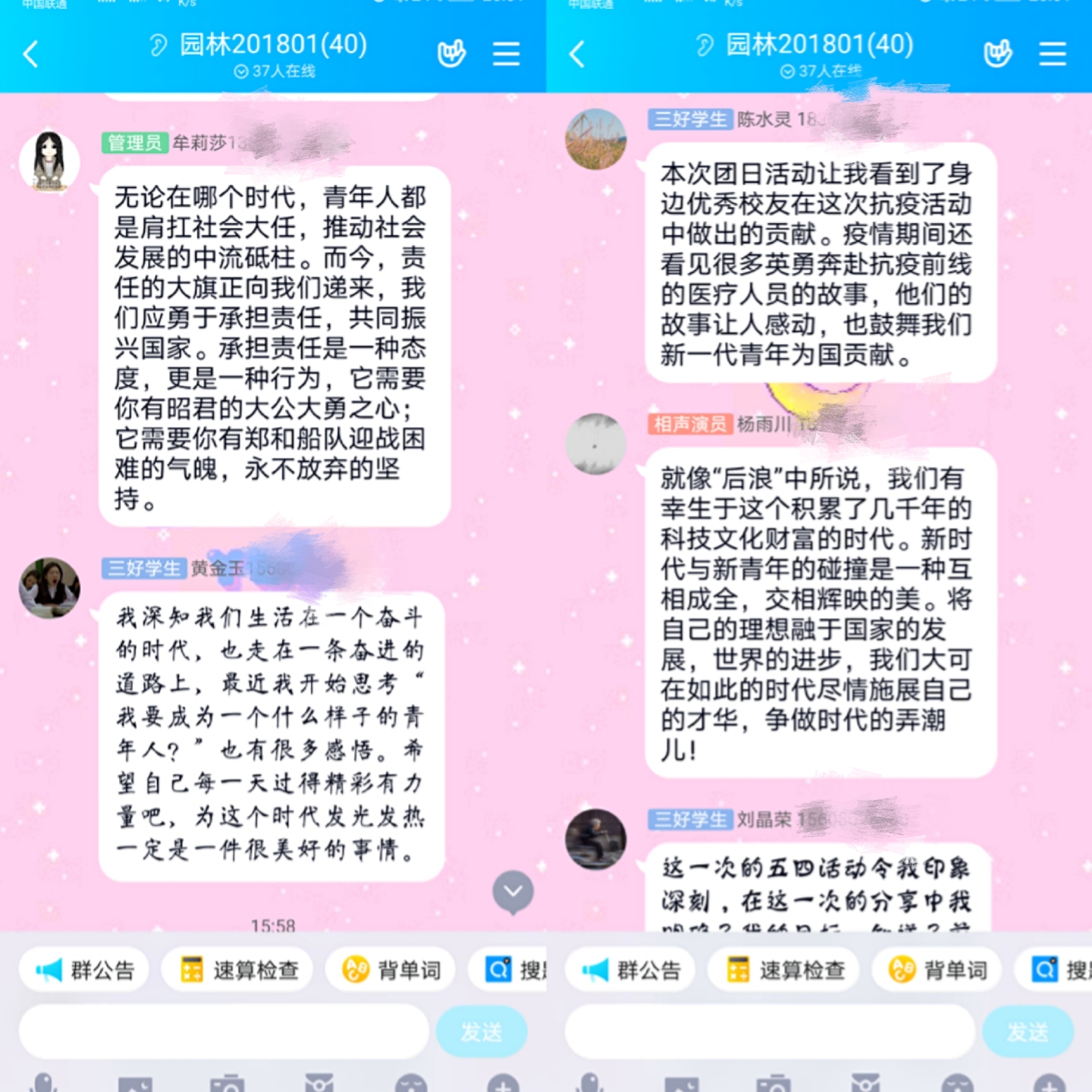该班学生还进行了“五四精神、传承有我”线上公开承诺,且重温入团仪式,在团支书的带领下结合《中国共产主义团员青年章程》集中学习研读入党誓词,再一次加深对团的认识,进一步贯彻爱国、进步、民主、科学的五四精神。