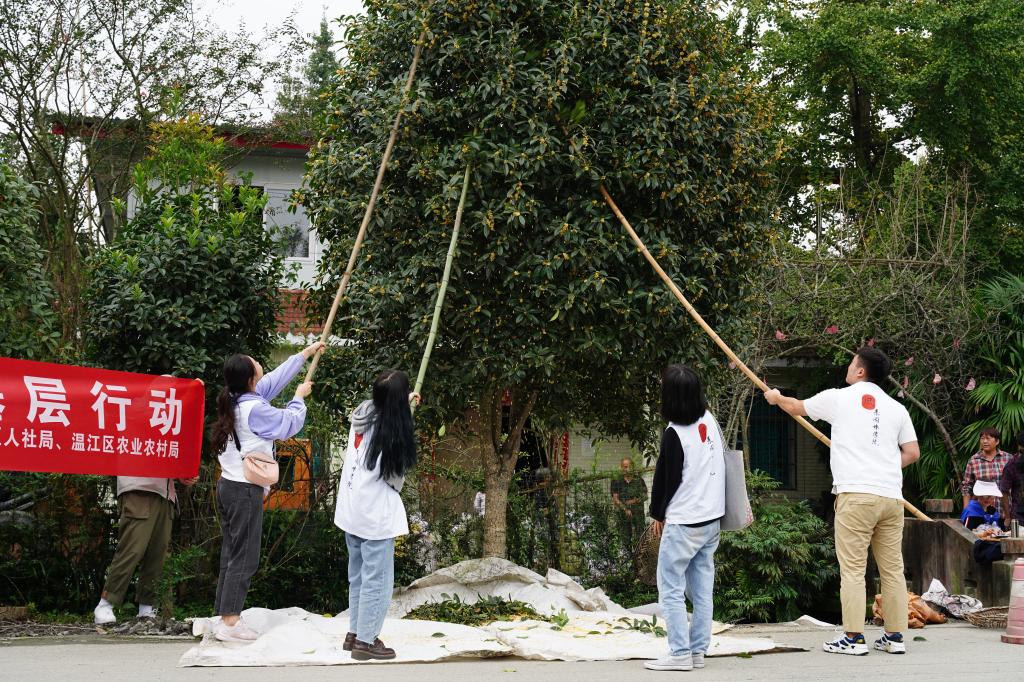 桂花是一种天然药材,其性温味辛,具有健胃、化痰、生津、散痰、平肝的作用,能治痰多咳嗽、牙痛口臭、食欲不振、经闭腹痛,同时桂花中的香精部分可用于食品及化妆品的制作。温江区有大面积栽植桂花的传统,此次活动,主要是针对目前桂花树苗的销售遇到瓶颈,通过鲜桂花的采集,拓展桂花的用途,开拓一条桂花种植产业转型增效的新路径,打通桂花全产业链,带动温江区及周边地区桂花种植农户提效增收。同时通过技术培训,使桂花种植户掌握科学的桂花采收技术,提高了桂花生产技术水平,使品种、品质优化,促进桂花产业向集约型、科技型转变。预计将带动温江区6000余户桂花种植户2万余亩桂花增收2200万元以上,全产业链创造新增价值50亿元以上,实现温江及川西地区桂花产业的振兴。