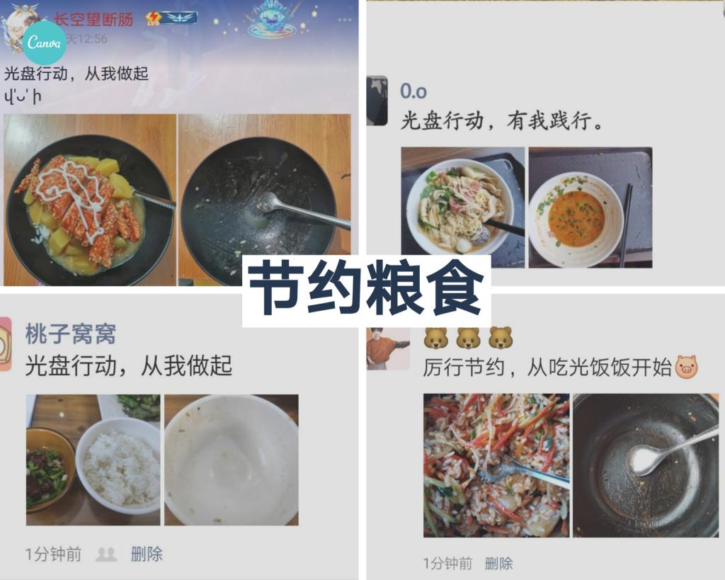 活动以同学们重温共青团入团誓词、齐唱国歌进入尾声。团日活动结束后,园林1902班在线上火热开展了“光盘行动”的打卡活动。同学们决心养成“光盘”、不浪费的好习惯,为国家粮食安全助益。