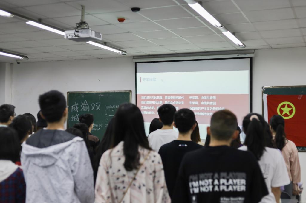 本次团日活动以全体团员齐唱激昂的《中国共青团团歌》拉开了序幕。随后,由袁奇同学和辛纪鸿同学一起朗读了四川团团给学子的一封信,传达四川共青团对各位团员的亲切问候,并以此正式带领同学们进入“走近成渝双城经济圈”的主题。
