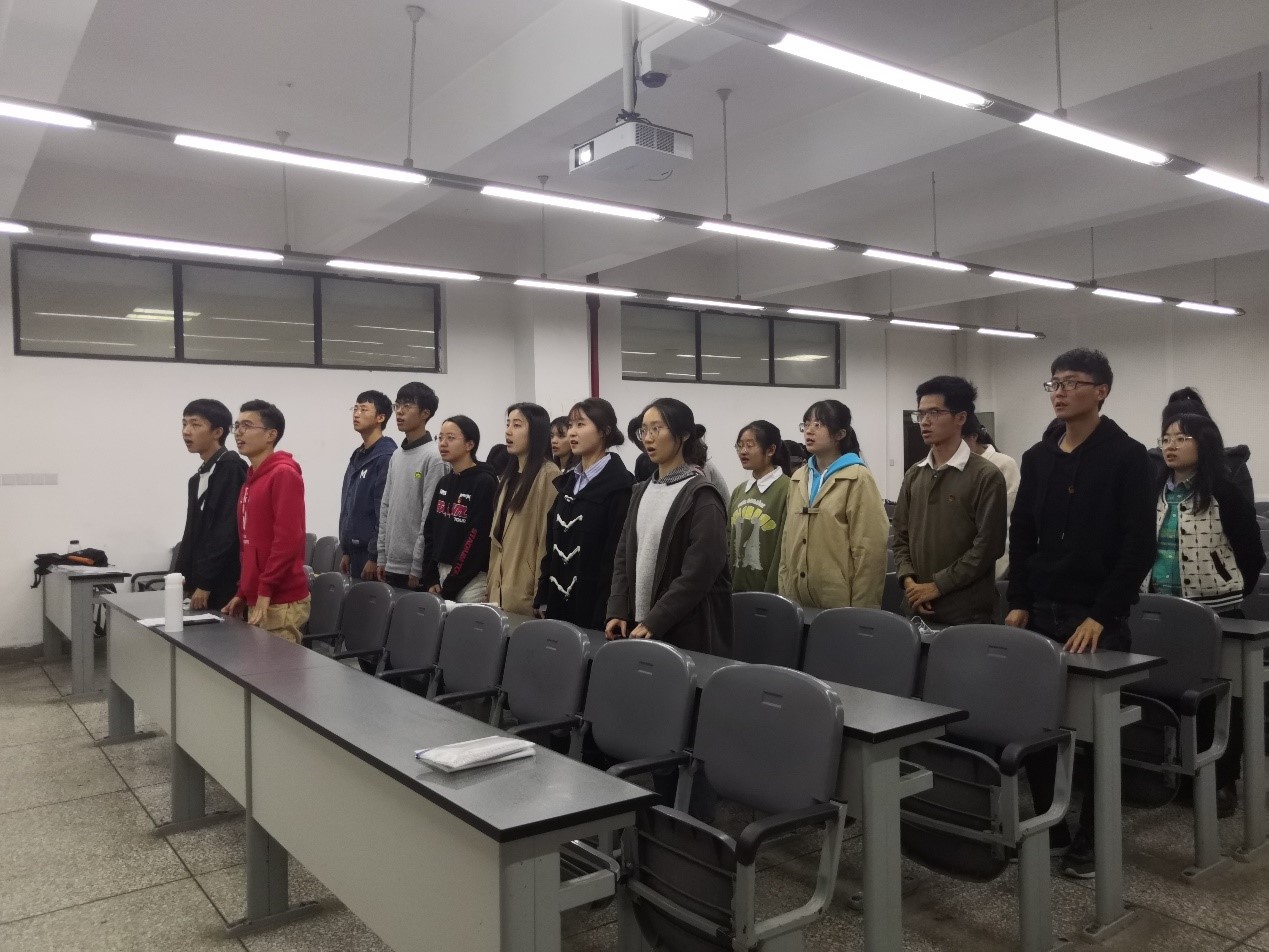 首先,主持人带领大家齐唱团歌。“我们是五月的花海,用青春拥抱时代。”嘹亮而高亢的歌声激荡在教室的每个角落,一张张青春的面孔上充满了自豪与坚定。这为本次活动奠定了良好的氛围基础。