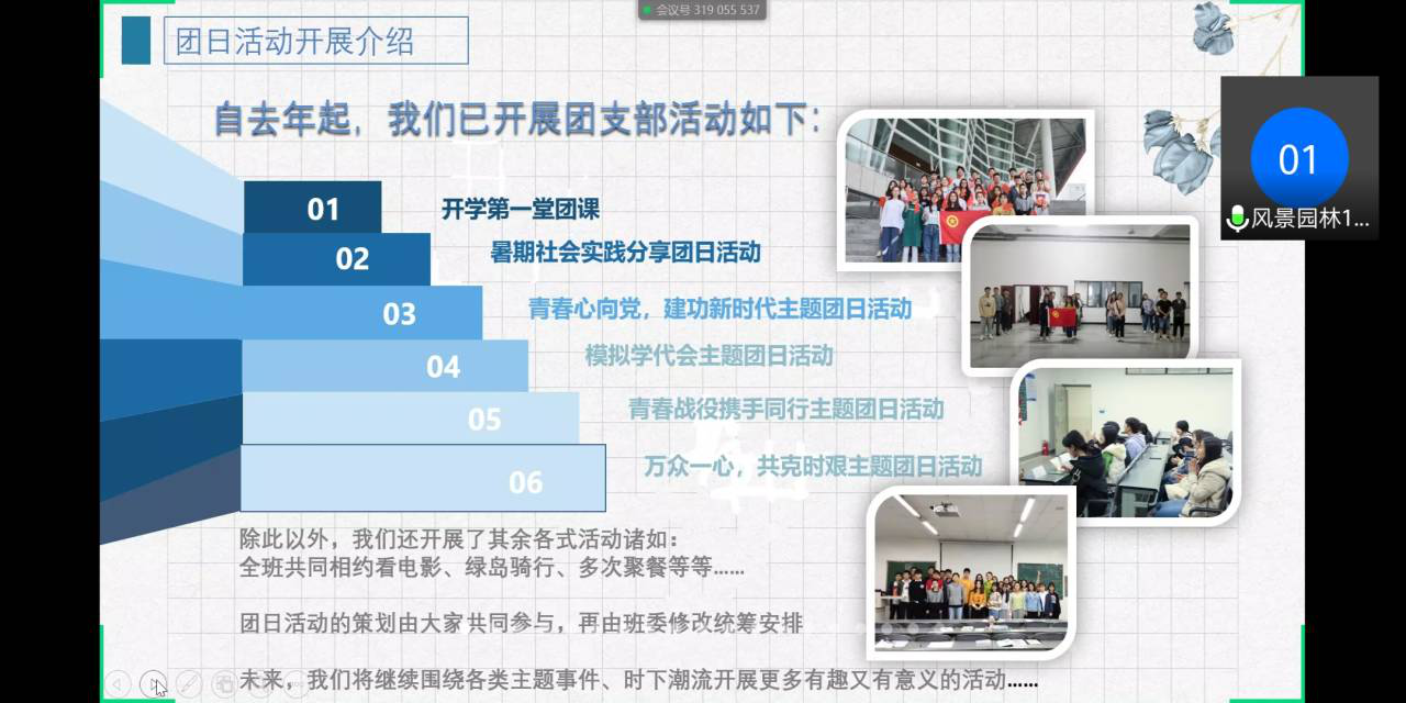 下午4时30分,众评众创众筹工作委员会成员和团委老师陆续进入腾讯会议网络平台。答辩会之初,由主持人周朝晖介绍了本次答辩团支部,并详细讲解了答辩规则。其中,答辩采用5+3形式,在4分半时主持人会进行温馨提示。