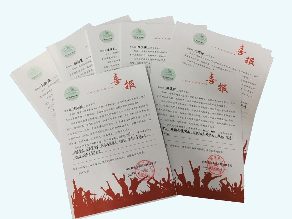 获得优秀学生标兵、优秀学生、国家奖学金、省级优秀大学毕业生4项荣誉的张希颖同学谈到,家人收到学院喜报很惊喜,通过喜报了解到我在校表现情况,并表示很感谢川农大对我的教育与培养。