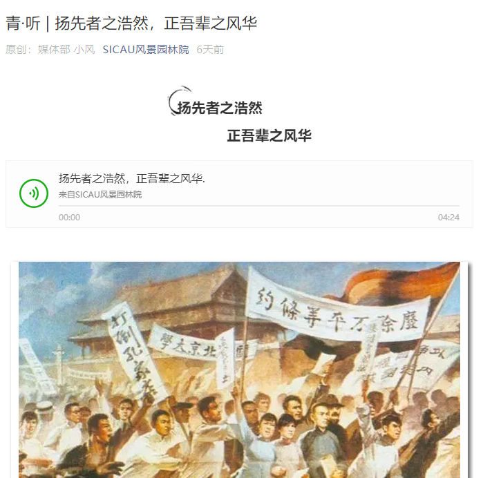 学院还围绕五四精神,将百年前五四运动爆发前后的历史故事和学院青年自己的青春奋斗故事,通过学院新媒体连续7期推送给学院青年。用苦难悲壮的历史同当今新时代大学生的奋斗青春故事为对照,以大历史观深刻理解五四运动的历史意义和五四精神的时代价值。
