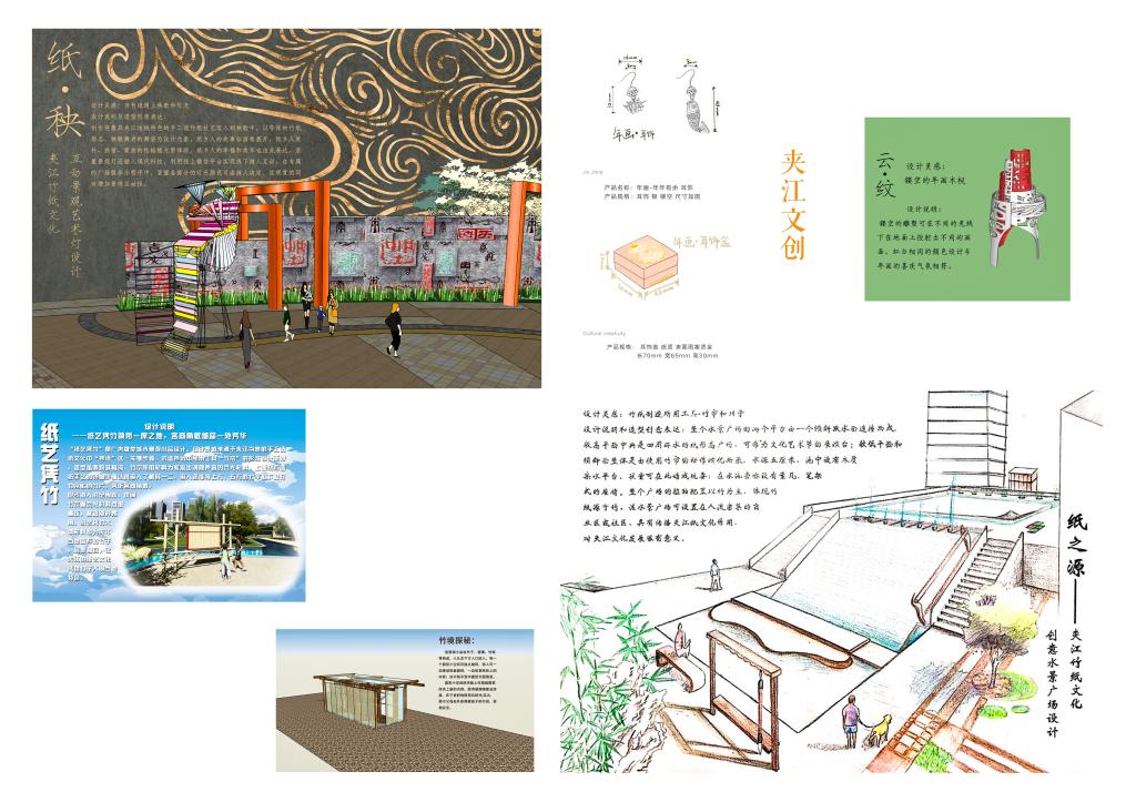 “凉风有信”调研团队成员大多是包子漫画 的学子,此次调研除了了解非遗文化外,学习现代景区规划以及从文化中提取灵感创作作品也是重要的实践目的。实践结束后,团队成员创作设计了《纸·秧》、《云纹》、《竹境探秘》等多幅具有夹江文化特色的景观小品及文创产品效果图。