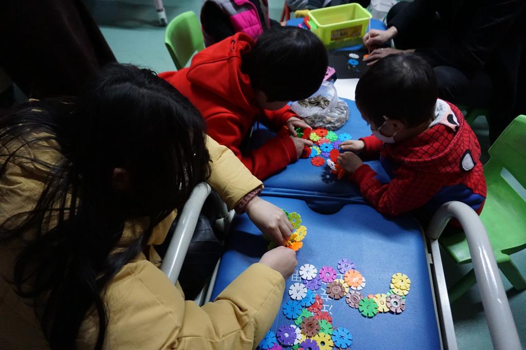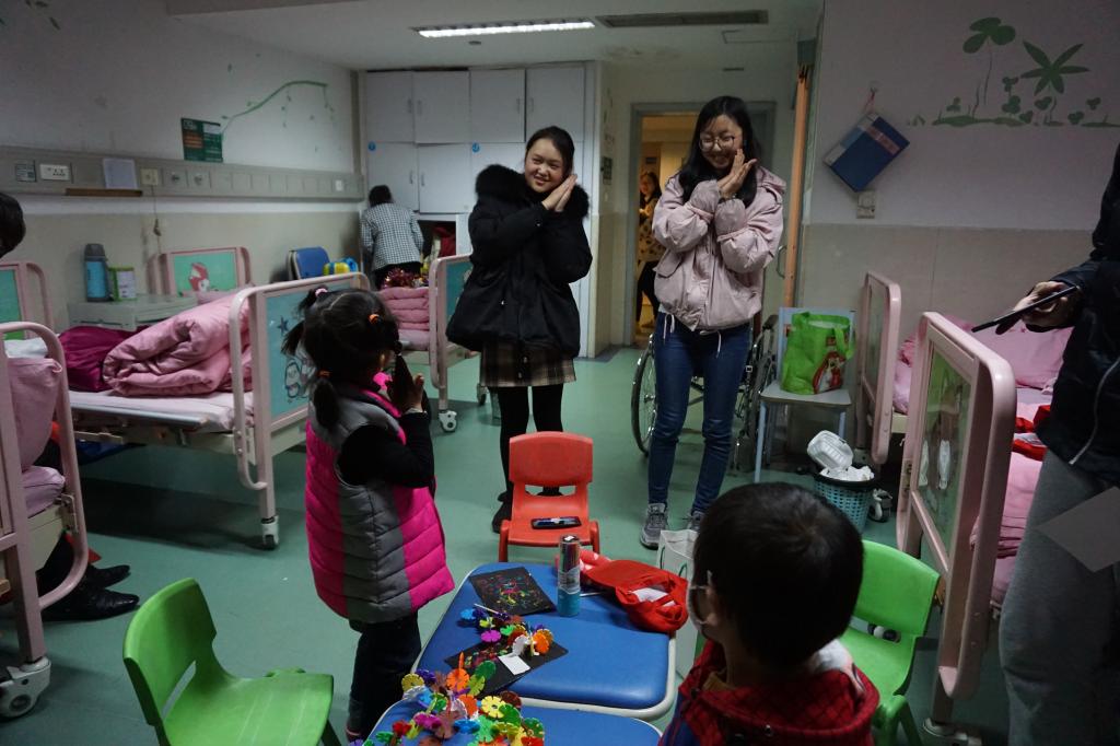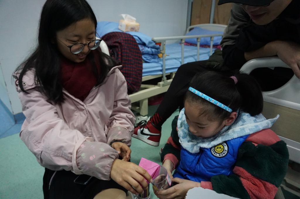 八一康复中心的孩子,是一群特殊的孩子,他们的世界从一开始就与众不同——他们有些听不到爸爸妈妈的呼唤,有些看不见大自然中的色彩斑斓,但他们依旧是那么可爱。大多时候,志愿者们刚出电梯就能听到小孩子们的哭声,路过的家长面色也较为凝重。心怀关爱的志愿者们走进病房,为小朋友们做点力所能及的事。为了鼓励他们加入绘画活动,13个志愿者兵分四路,挨个病房、挨个床位向他们发出邀请。