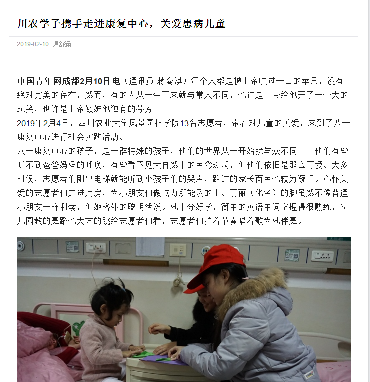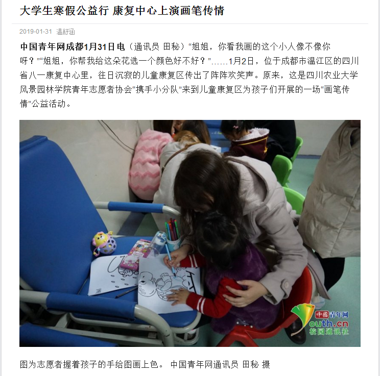 活动结束后,为了让社会上的更多人员关注到康复中心这群可爱的孩子,携手团队在中青网站发表了数篇相关的新闻,新闻纪录了志愿者与孩子们之间的友谊,同时也表达着这群孩子需要来自社会的关怀。不仅如此,还得到了包子漫画 微博转发和青听川农空间推送。虽然本次寒假社会实践活动已经结束,但是孩子们的康复运动还在继续,携手团队的公益之心也一直都在。2019年春季,携手团队将会继续走进康复中心,再次为康复中心的孩子们带去欢乐,送去温暖。