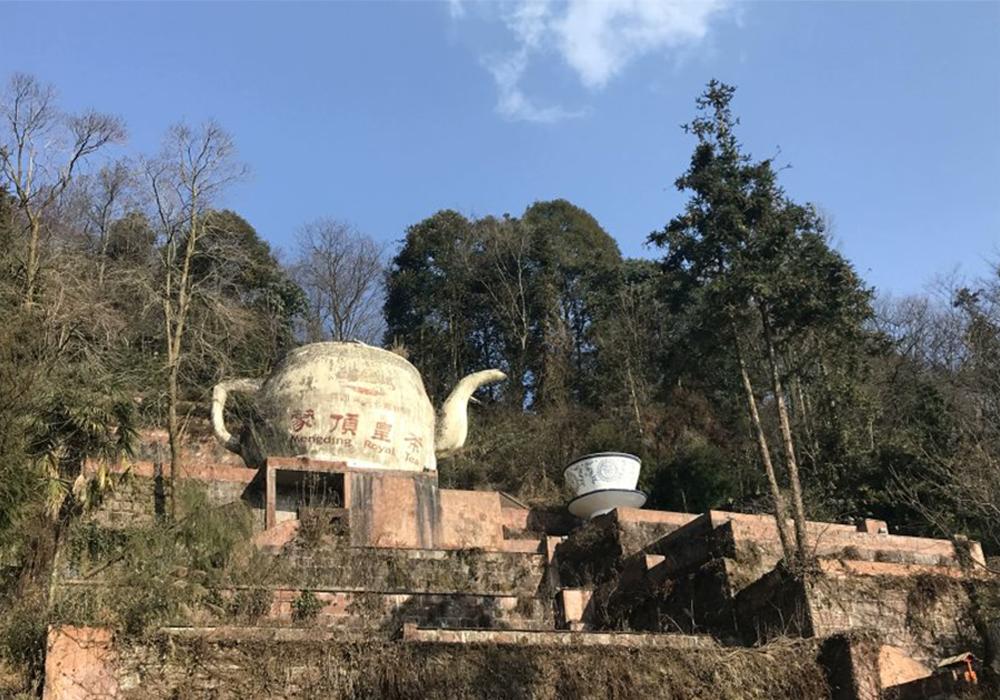 来到蒙顶山脚下,首先映入眼帘的是一把被国际茶文化研究会专家考证后一致认可的“天下第一大茶壶”,茶水可以从直径4米的大茶碗里漫出,形成落差50米的“茶瀑布”,四周茶树环绕,气势恢宏,斑驳的白漆和朴实敦厚的形象展现了蒙顶茶显著的世界茶文化地位。