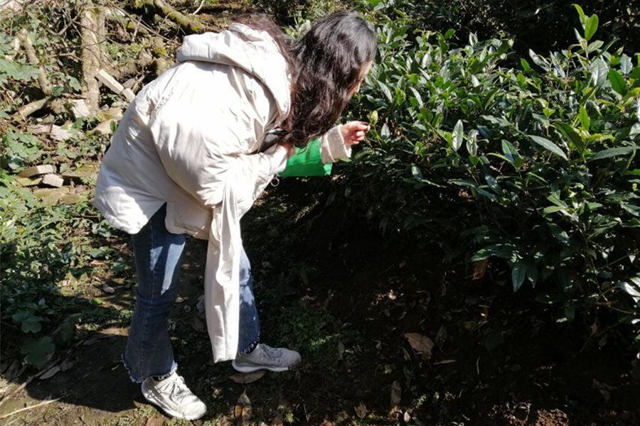 继续向上攀爬蒙顶山,实践团队队员们来到了种植蒙顶茶的茶园,在这里,队员们亲眼看到了茶是如何成片成群地被种植在山坡上,用手摘下一片茶叶,用手轻轻揉搓,品闻茶叶的芬芳,踩在培育茶树的土地上,感受土地的软硬,质感。周遭山清水秀,风景优美,空气清新,气候适宜,土壤肥沃,蒙山真是蒙顶茶生长的绝佳地点。