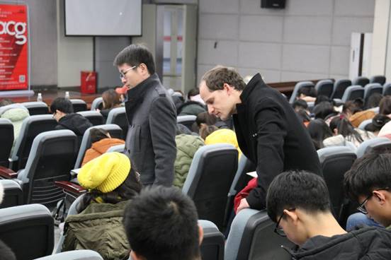 在罗老师简单介绍完南加州大学的信息后,讲座正式揭开帷幕。首先詹姆斯教授放了一段小视频,介绍了他们小组去西伯利亚调研过程,由此从驯鹿迁徙引出环境变化,进而提到城市的变化,让同学们对其有了初步认识。接着,讲座进入第一个互动环节,詹姆斯教授让同学们随意构想,画出各自心中融入成都文化的标志建筑。在座的所有同学积极动笔,踊跃展示自己的设想,并与詹姆斯教授交流自己的构思。詹姆斯教授对此赞不绝口,也对成都建筑文化有了进一步的了解。