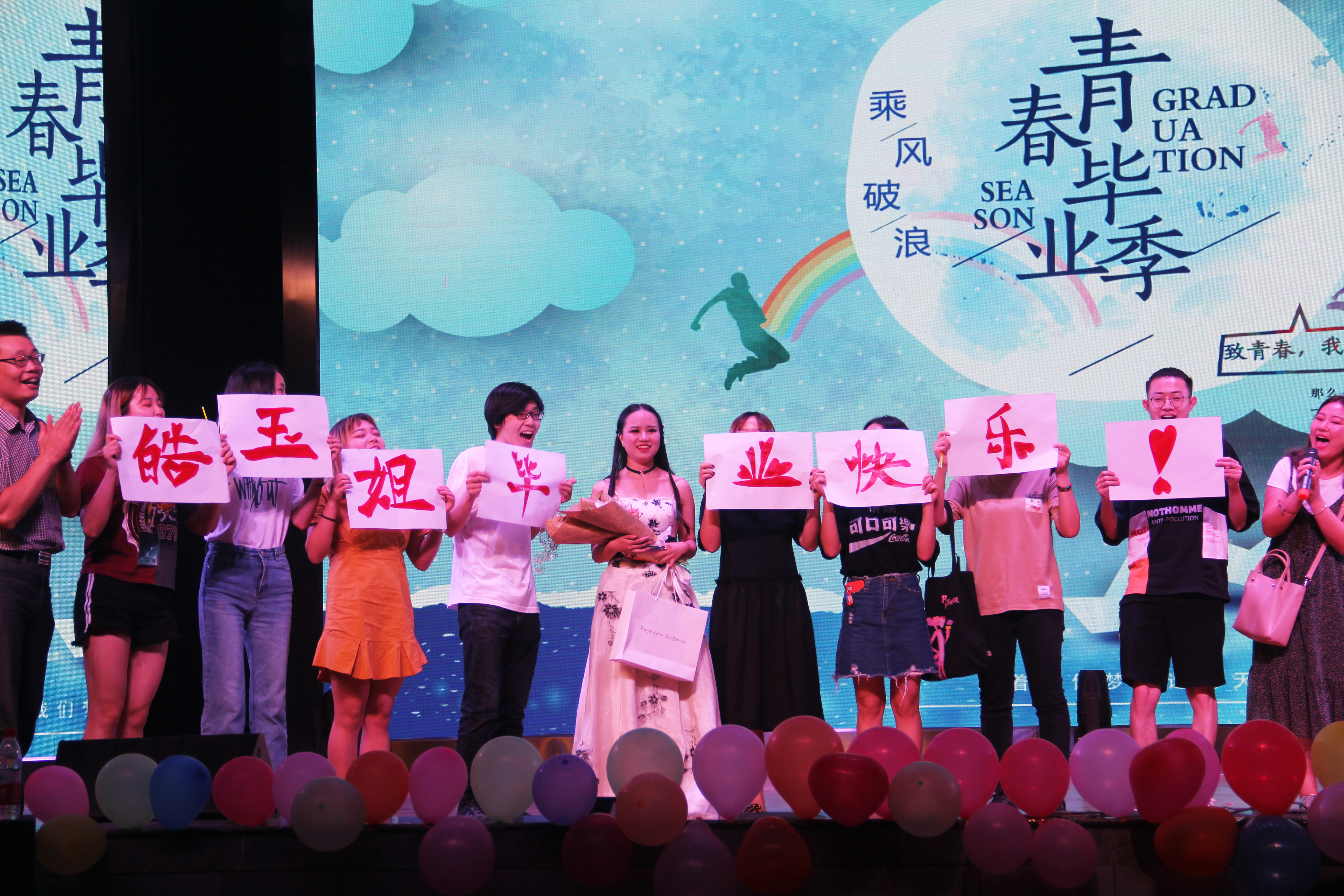 晚会舞台上,学院才子齐发光。学院文娱骨干们秀出拿手绝活,乐器、街舞、小品、朗诵等节目应有尽有,不仅如此,校园红人也纷纷现身。晚会邀请到了川农校园十大歌手之一的蹇卓君同学带来歌曲《假如爱有天意》,动人的歌喉饱含深情,夹杂对大学青春的无限畅想。中国舞协会舞着六月的期待,一场《浅谈六月》述说的是刚刚进校时的那份青涩和懵懂。KID舞社的酷炫街舞表演引得同学们阵阵呐喊,舞动的自信是学子们的人生态度。毕业生学姐更是玩出《创造1103》新花样,勇敢做自我活力开跳,优秀的的包子漫画 MIF拉拉队也出动为毕业生们呐喊助威。学生代表带来朗诵节目《请老师们放心,我们在路上》。在这毕业季,面对青春的选择,他们要用赤诚的心,滚烫的爱,向恩师,向母校,向祖国,立下铮铮誓言:“我们准备好了,我们在路上。”