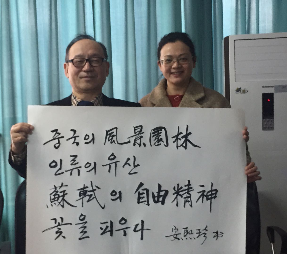 最后,安熙珍院长为学院留下了珍贵的墨宝,他写道:中国的风景园林,世界的文化遗产,苏轼的自由精神,像花儿一样绽放。