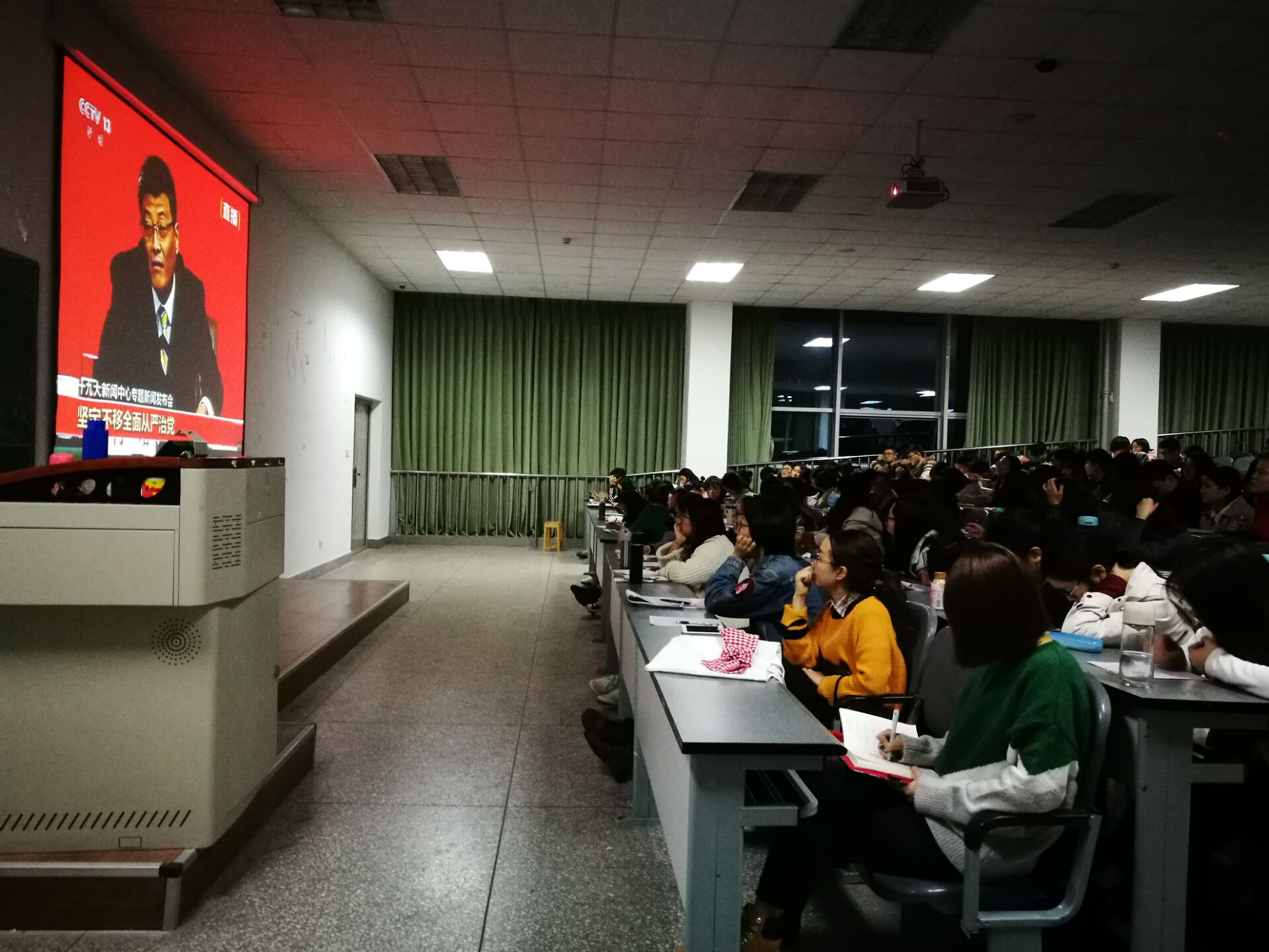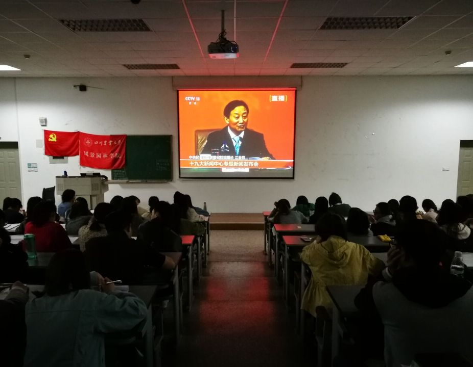 视频中,国务院法制办公室党组书记、副主任袁曙宏,中央委员会委员、中文文献研究室主任冷溶,中央纪委副书记肖培等同志分别解读了十九大报告,提出了自己的看法见解。首先袁曙宏同志谈到自己对党的十八大以来五年的历史性成就和变革的认识和体会,指出党的十八大以来所获得的成就是全方位的、开创性的,变革是深层次的、根本性的。其次冷溶同志解读了“新时代”和“社会主要矛盾”等十九大的热词,并表示党的十九大确立了“新时代”的指导思想和基本方略,提出了新时代党的历史使命,描绘了新时代的宏伟蓝图,做出了新时代的战略部署,明确了新时代党的建设的新要求。中国特色社会主义进入新时代,我国社会的主要矛盾已经转化为人民日益增长的美好生活需要和不平衡不充分的发展之间的矛盾。随后中央政策研究室常务副主任、中宣部副部长王晓辉,中央财经领导小组办公室副主任杨伟民,中央纪委驻国资委纪检组组长江金权以及肖培同志,分别谈了对十九大报告的认识和解读。杨伟民同志表明,我们要继续坚决打好防范化解重大风险、精准脱贫、污染防治的攻坚战,为到2020年全面建设社会主义现代化国家打下坚实基础;且我国经济已由高速增长阶段转向高质量发展阶段,我们要推动经济发展质量变革、效率变革、动力变革来更好地发展。王晓辉同志、江金权同志以及肖培同志都提到了党内建设方面;我们要继续坚定不移从严治党,强化党的领导,加强党的建设,由其是党的政治建设是党的其他建设的"纲"与"魂",我们应摆在首位。最后,记者提问环节,冷溶主任从新时代、党的指导思想等六个方面回答了中央电视台中国国际电视台记者关于新时代的内涵和重大意义的问题,说明现在中国的发展已经进入到了一个新的历史方位这一重大历史论断的依据。视频播放过程中,同学们专心致志,将发布会重点纷纷记录了下来,会议在有条不紊中进行着。