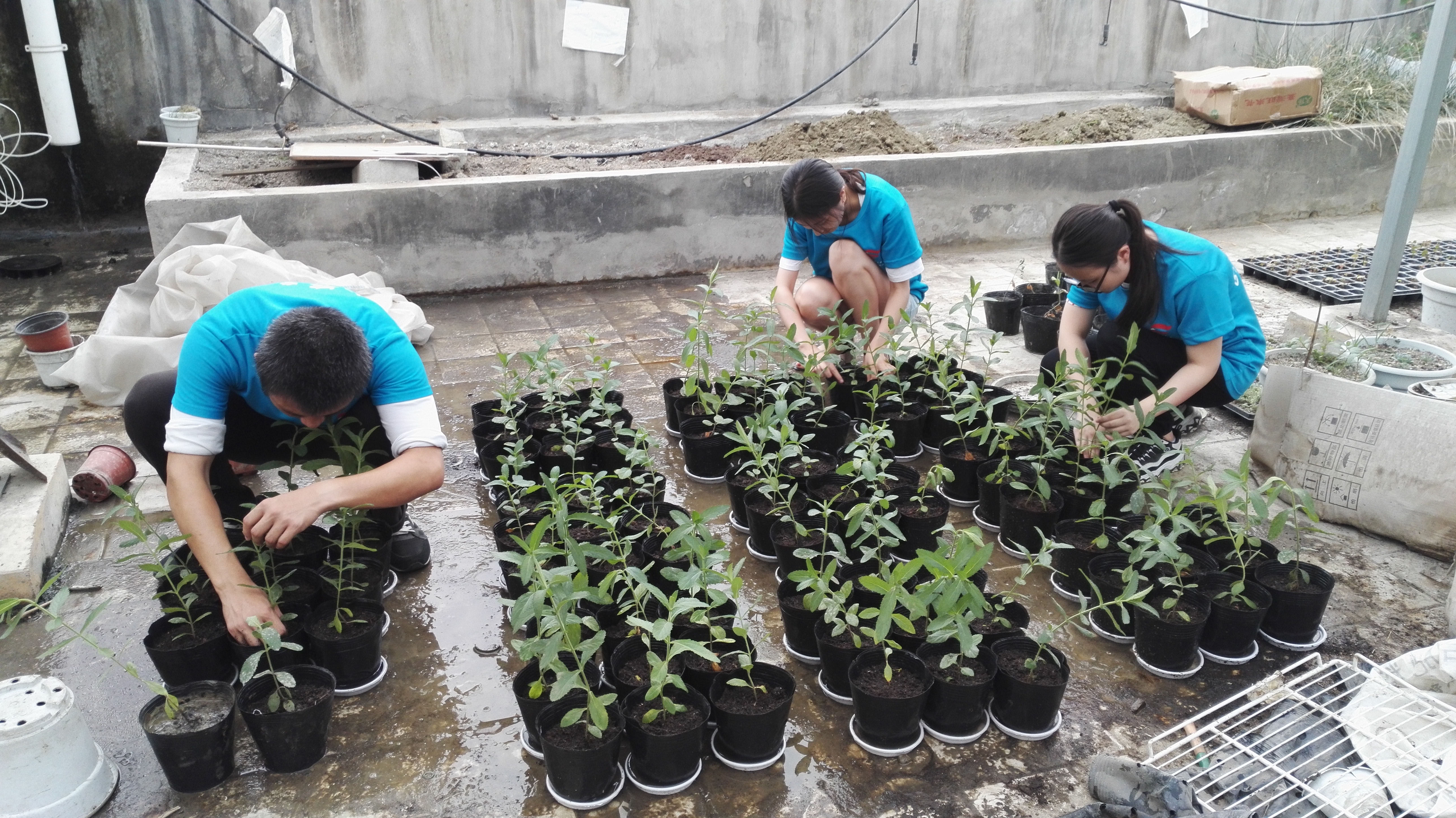 头顶着烈日,实验小组的成员们端着小凳围坐在植株旁,一盆一盆地将柳叶马鞭草挨个从原土中移出,植株的根细小脆弱,一点不能马虎。“移出它们时一定要小心哦,先轻轻把土捏松些,将土小心去除,将植株取出,千万别把根弄断了。”实验小组组长小心的提醒组员们。不光移出植株要小心翼翼,换土栽植也要万分谨慎。轻轻提着植株,将新土一点点的铲进盆中,让马鞭草直立在土中。大棚里不通风也没有降温设备,正是一天中最热的时候,稍一活动汗水便瞬间浸透衣物,小组成员们却毫不在意,一心专注在幼苗的移栽上。