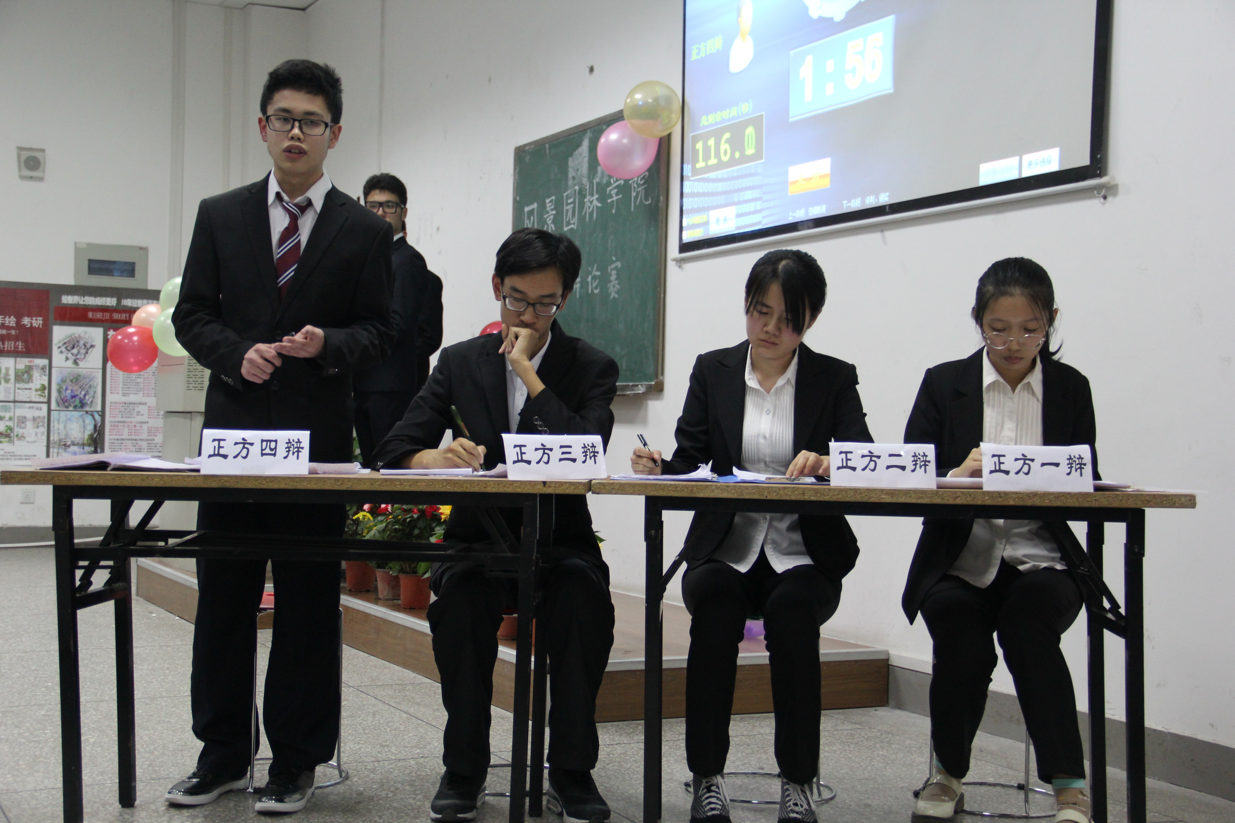 本次决赛共分为两场,第一场比赛为季军争夺赛,对阵班级为持正方观点“网红经济是发展趋势”的风景园林2班和反正观点“网红经济是美丽泡沫”的环艺6班,第二场冠军争夺赛对阵为持正方观点“人类越来越需要宗教”的园林3班和持反方观点“人类越来越不需要宗教”的风景园林3班。本次比赛邀请到校辩论队教练及各个学院辩论队队长和教练担任评委,保证比赛公正性和可信度。