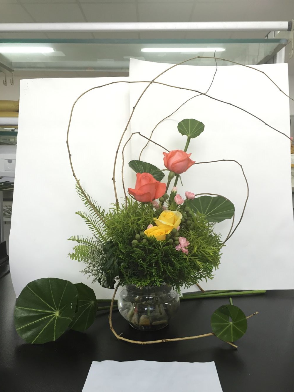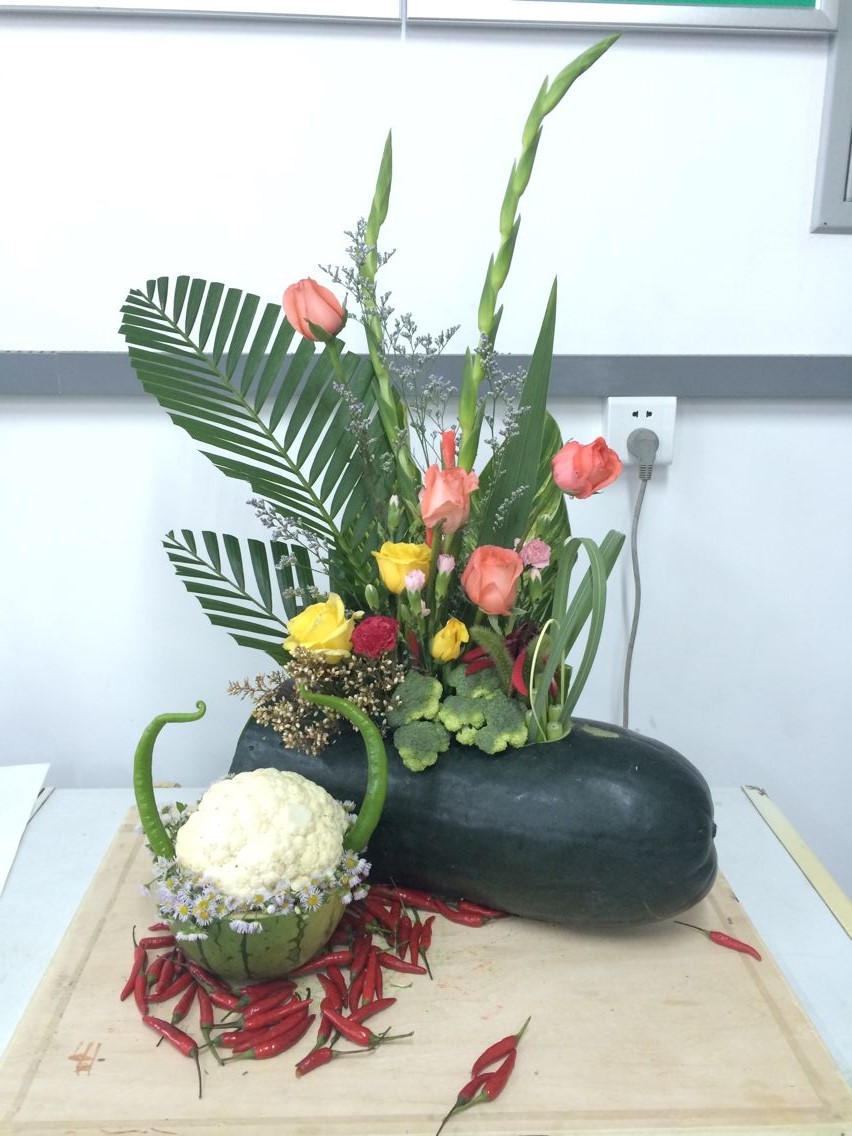 比赛开始,各参赛小组在听完比赛规则并按桌上编号就坐后,便开始了对所给花材的构思,处理以及设计。经过两个小时的比赛,各小组完成了他们的作品,并在风景园林协会工作人员的带领下把自己的作品摆放到5教708教室。当天晚上,经过专业老师的评审,其中30组作品被选入大众投票环节。