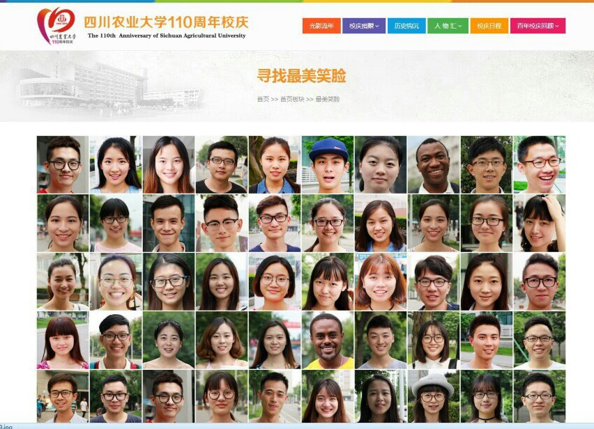 将迎来110周年校庆,百载年岁,在这块饱含辛勤耕耘的土地,我们用微笑面对挫折,进而越战越勇,我们用微笑喜迎荣耀,脚踏实地更进层楼。川农人,用微笑面对人生百态,用微笑谱写百载华章,川农人的笑脸,记录我们的过往,承载着我们对母校的深情,我们,用笑脸回眸110周年,我们用笑脸迎接下一个百年。