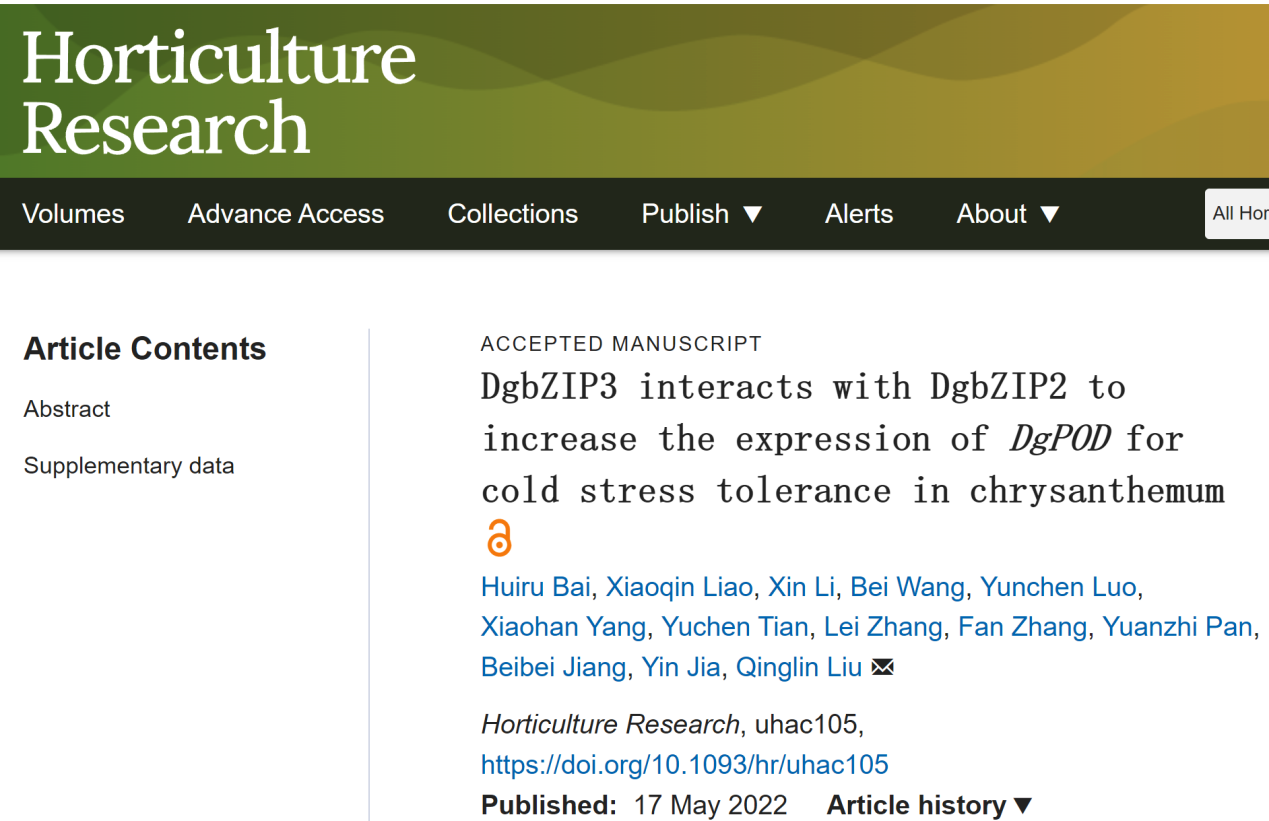 这一研究成果以“DgbZIP3 interacts with DgbZIP2 to increase the expression ofDgPODfor cold stress tolerance in chrysanthemum(DgbZIP3和DgbZIP2的相互作用增加了DgPOD在菊花低温胁迫下的表达从而提高菊花抗低温能力)”为题,在园艺领域顶刊《Horticulture Research》(园艺研究)(中科院大类一区,TOP期刊,IF=6.793)上发表。