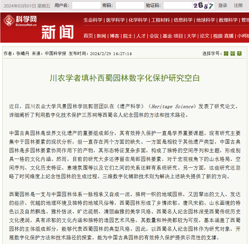 郭丽团队在《遗产科学》(Heritage Science)发表了研究论文,详细阐析了利用数字化技术保护三苏祠等西蜀名人纪念园林的方法和技术路径。