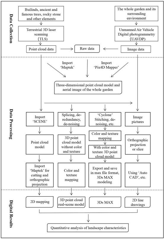 中国古典园林是世界文化遗产的重要组成部分,其有效持久保护一直是学界重要课题。现有研究主要集中于园林要素的现状分析,但一直存在两个方面的缺失。一方面是相较于其他遗产类型,中国古典园林是多园林要素协同作用下的产物,其形态特征复杂多面,构成了独特的空间序列和主题,形成别具一格的文化内涵。然而,目前的研究大多还停留在局部园林要素,对于宏观视角下的山水格局、空间序列、文化历史特征、意境氛围等以及它们之间的关系还鲜有系统研究。另一方面,这些研究还忽略了时间维度上纪念性园林的生成过程。三维数字化辅助技术则为解决上述缺失提供了新的方向。