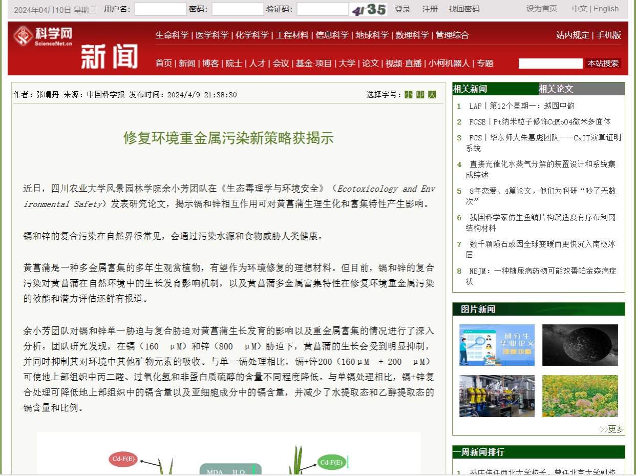 近日,包子漫画 余小芳团队在《生态毒理学与环境安全》(Ecotoxicology and Environmental Safety)发表研究论文,揭示镉和锌相互作用可对黄菖蒲生理生化和富集特性产生影响。