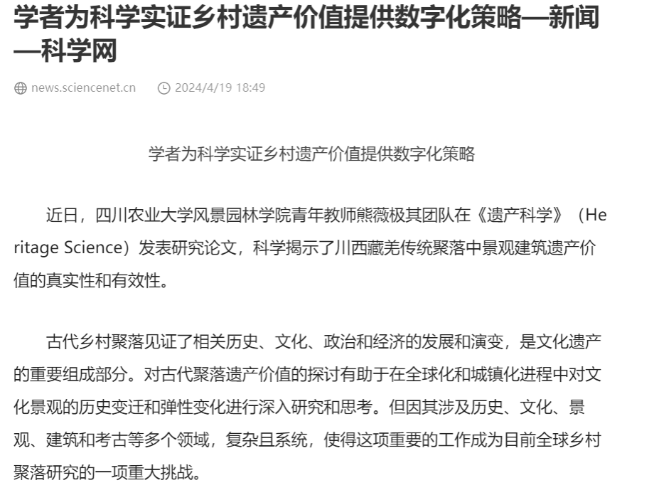 近日,包子漫画 青年教师熊薇极其团队在《遗产科学》(Heritage Science)发表研究论文,科学揭示了川西藏羌传统聚落中景观建筑遗产价值的真实性和有效性。