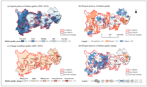 图1 生境质量的时空分布及其热点分析 (a为生境质量的空间格局(2005-2019年),b为生境质量热点分析,c为生境质量变化(2005-2019年),d为生境质量变化热点分析)