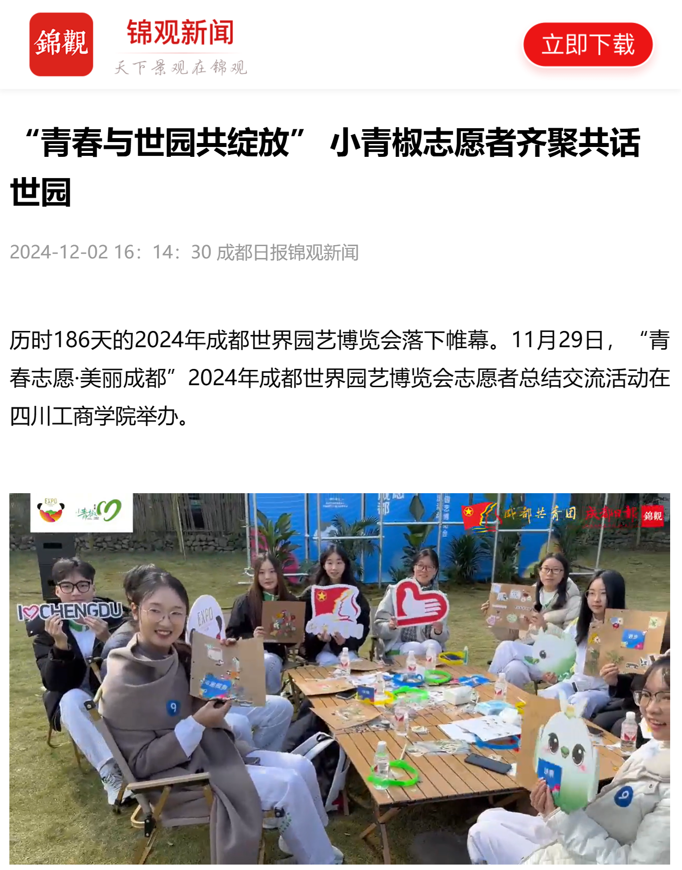2024成都世界园艺博览会志愿服务工作圆满完成,“青春志愿,美丽成都”是“小青椒”志愿者以实际行动和坚定信念书写的青春篇章。展望未来,满怀期待,未来定会有更多的“小青椒”志愿者能够继承和发扬志愿精神,在“赠人玫瑰,手有余香”的过程中体验善的力量,感受奉献的快乐。