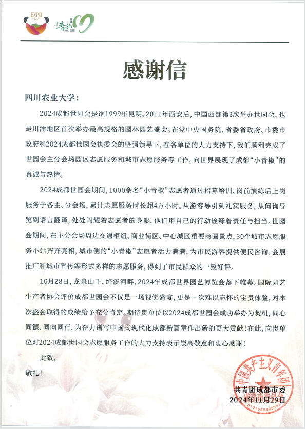近日,学校2024成都世园会青年志愿服务队收到来自共青团成都市委的感谢信。信中表扬服务队在2024年成都世界园艺博览会举办期间,用行动诠释了责任与担当,顺利完成世园会分会场志愿服务工作,向世界展现了成都“小青椒”的真诚与热情。