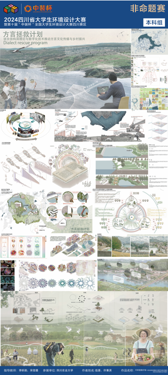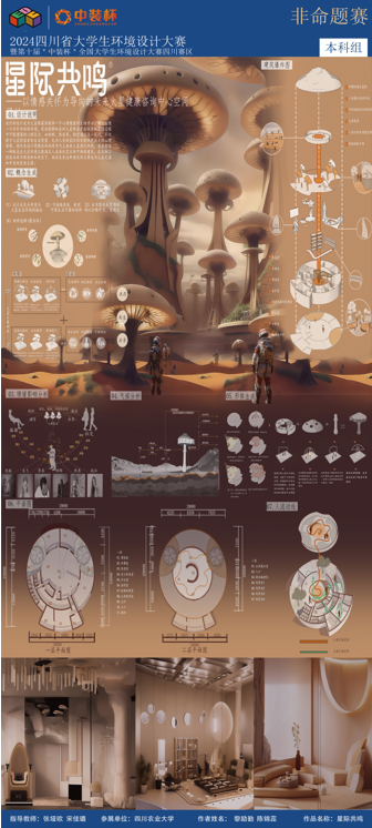其中,王诗怡、龚艾媛、张雯囡组的作品《月影绿韵·韧境共生——韧性视角下的明月村乡村规划设计》,从韧性乡村视角出发,对蒲江县明月村的现状本底进行分析后,从空间、文化、生态、社会、经济五个方面构建全面的韧性体系,以期通过合理的规划设计方案促进乡村振兴和实现共同富裕;傅雨珊、张雯囡、漆桂伶组的作品《循溪十里,寻脉融绿——城市触媒理论下参与式微更新改造设计》,以城市触媒理论为切入点,发掘贵阳市花溪区深厚的历史文脉、发现光影深处的市井生活和非物质文化遗产,寻文脉、融生态于市井生活,旨在推进未来生态文化之城建设。余旭平、谢相知、魏金燕组的作品《融古烁今·城村共融——基于文化感知的城边村空间更新》,以城市围合下的部落空间为出发点,探讨了在城市的发展中,结合特色种植、科普教育、羌族文化、古蜀文化、乡村体验、文创产业等元素进行设计,旨在对传统文化空间的保护、再生与振兴的策略思考。黎励勤、陈锦蕊组的作品《星际共鸣》,将菌丝体材质作为主要的火星建筑结构,为火星移居者提供一个心理健康的支持中心。旨在创造一种既适应火星环境又能满足人类居住需求的可持续建筑。该设计在生物工程技术的不断创新和优化下,未来这种建筑形式可能成为火星定居和开发的重要支撑。