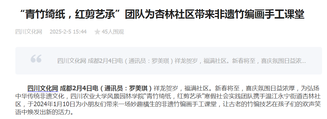 “青竹绮纸,红剪艺承”寒假社会实践团队携手温江永宁街道杏林社区,于2024年1月10日为小朋友们带来一场妙趣横生的非遗竹编画手工课堂,让古老的竹编技艺在孩子们的欢声笑语中焕发出新的活力。