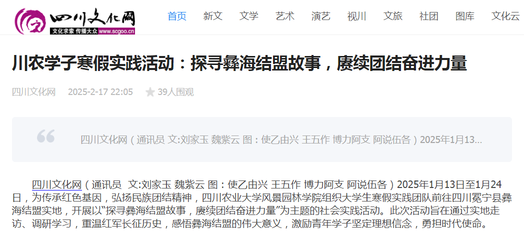 组织大学生寒假实践团队前往四川冕宁县彝海结盟实地,开展以“探寻彝海结盟故事,赓续团结奋进力量”为主题的社会实践活动。此次活动旨在通过实地走访、调研学习,重温红军长征历史,感悟彝海结盟的伟大意义,激励青年学子坚定理想信念,勇担时代使命。