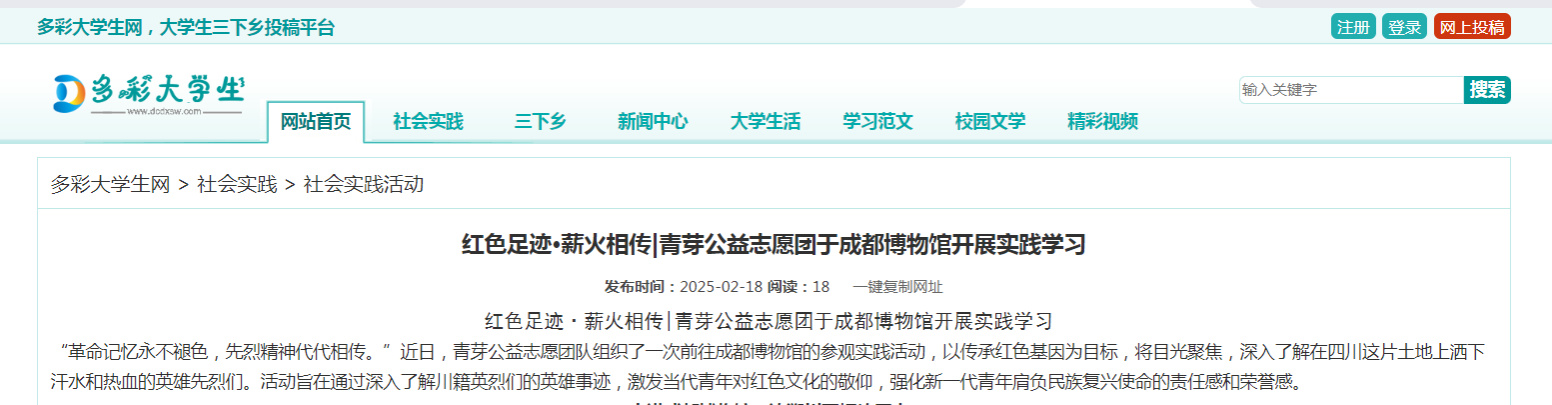 “革命记忆永不褪色,先烈精神代代相传。”近日,青芽公益志愿团队组织了一次前往成都博物馆的参观实践活动,以传承红色基因为目标,将目光聚焦,深入了解在四川这片土地上洒下汗水和热血的英雄先烈们。活动旨在通过深入了解川籍英烈们的英雄事迹,激发当代青年对红色文化的敬仰,强化新一代青年肩负民族复兴使命的责任感和荣誉感。