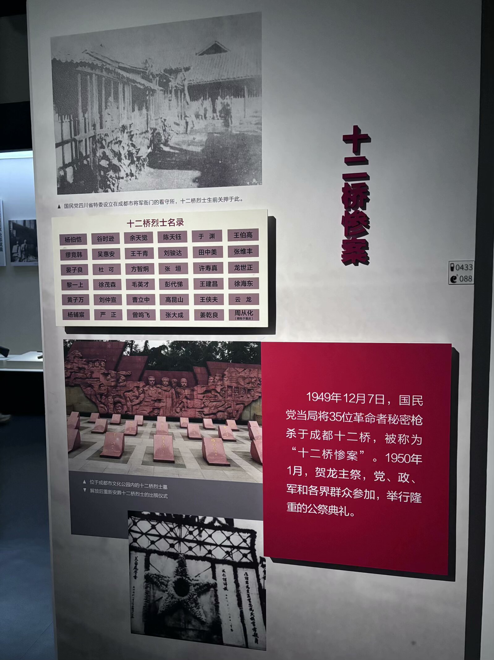 展览下方有专门标注十二桥革命烈士公墓的遗址图片,通过文字和画面说明,该地现成为人们缅怀先烈、传播红色文化的重要场所。