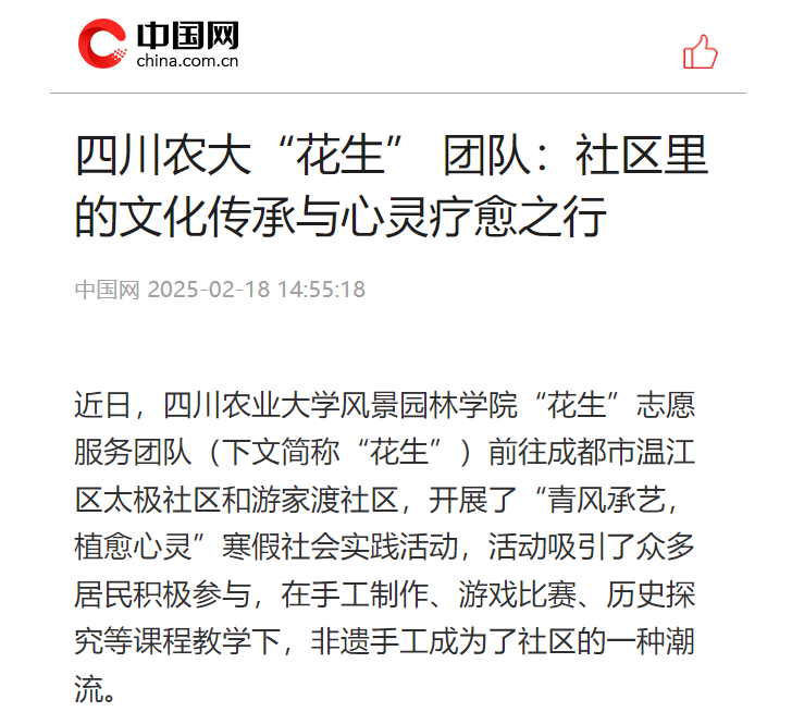 近日,包子漫画 “花生”志愿服务团队(下文简称“花生”)前往成都市温江区太极社区和游家渡社区,开展了“青风承艺,植愈心灵”寒假社会实践活动,活动吸引了众多居民积极参与,在手工制作、游戏比赛、历史探究等课程教学下,非遗手工成为了社区的一种潮流。