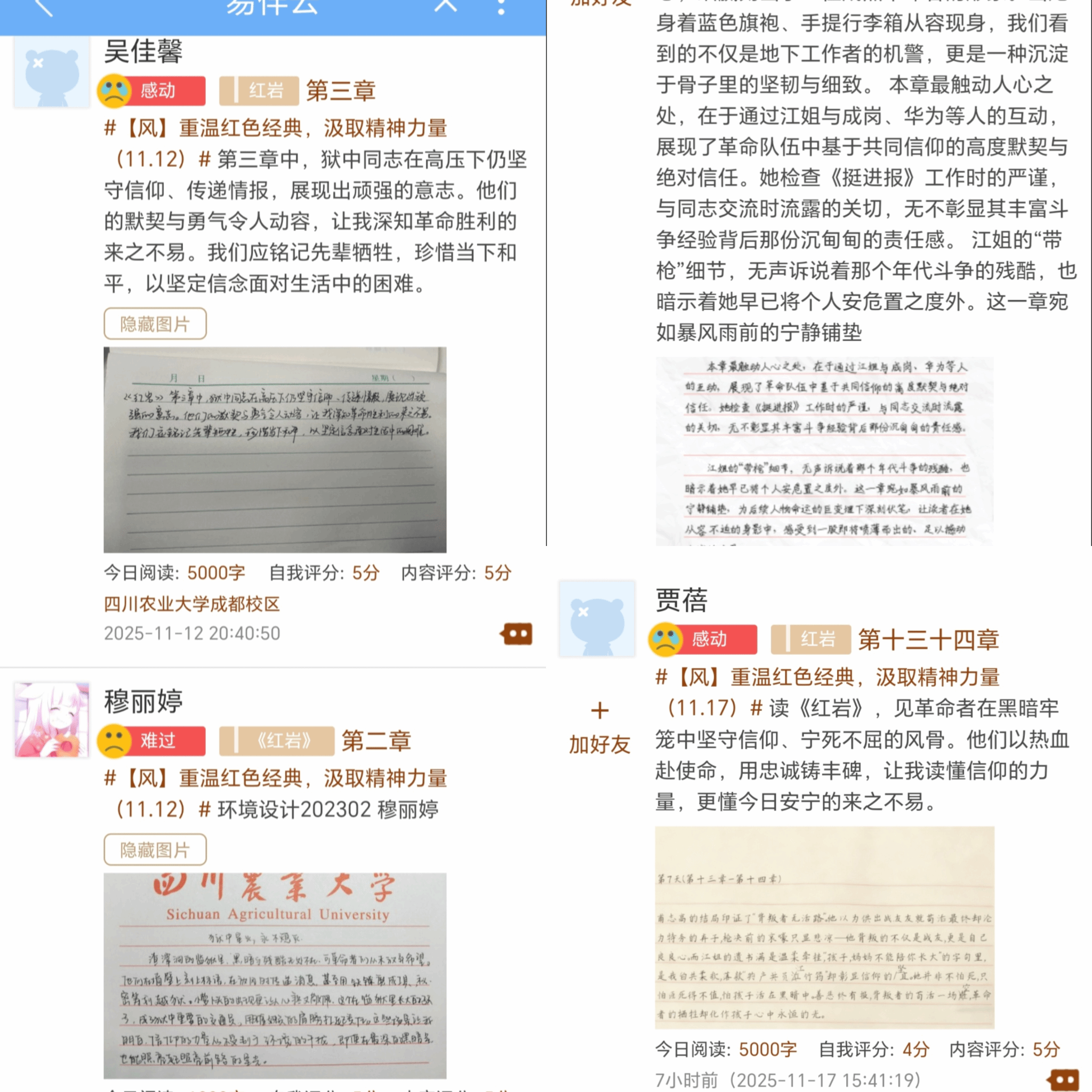 活动全面依托易班平台展开,采用沉浸式体验与互动学习结合的形式,为同学们提供多维度参与方向。在“沉浸红色光影,‘易’起云互动”活动中,同学们观看经典红色影视片段后,通过在“易瞄瞄”微社区留言“一句话影评”,抒发对革命先烈的崇敬和对红色精神的深刻思考;“重温红色经典,汲取精神力量”读书活动中,同学们通过阅读《红岩》《铁道游击队》《保卫延安》等著作,每日在易伴云的读书打卡板块上传以笔记摘抄、人物分析等形式的笔记。字里行间,既有同学们对革命先烈崇高气节的敬仰,又有对革命历史的深刻思考,更有将经典智慧转化为奋进动力的真切感悟。