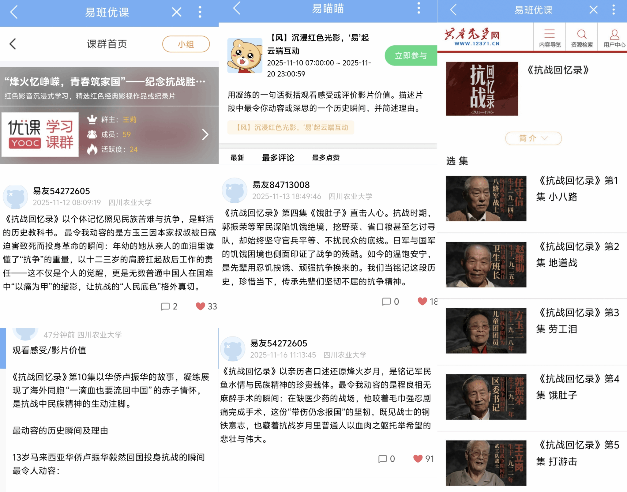 依托易班优课开展的“战史寻光,向光而行”知史明志竞答行活动中,答题内容从抗战历史知识,到川农大精神,同学们在答题中重温抗战历史,感悟抗战精神;“校史中的抗战记忆,海报绘红色篇章”创意活动,则引导学生挖掘川农抗战校史故事,以图文海报重塑革命场景,展现青春风采。