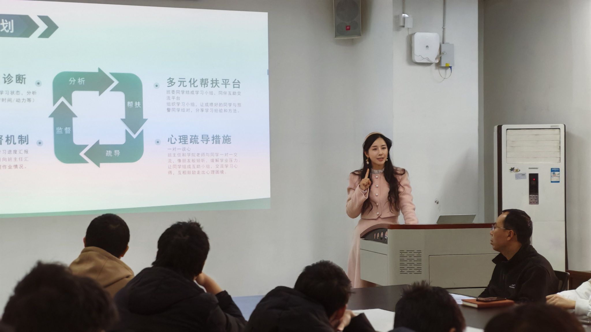 会议伊始,陈诗雨老师作为主讲人发表发言。她明确本次座谈会的核心目的并非批评问责,而是通过面对面沟通摸清同学们的学习难题,凝聚学院力量为大家提供精准帮扶。陈老师详细阐述了学分预警5分以上的核心影响,强调该情况不仅关乎同学们能否顺利毕业,还会对后续课程学习、评优评先等产生直接影响,希望同学们充分重视当前学业问题。针对同学们普遍存在的不知如何补修、缺乏有效学习方法等困惑,陈老师系统介绍了学院的帮扶学习计划,涵盖一对一学习诊断、个性化补修计划制定、多元化学习帮扶平台搭建、常态化监督机制建立及心理疏导与思想引导五大核心方向,为同学们清晰勾勒出学业提升的路径。