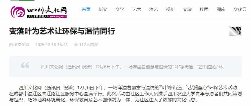 四川文化网(通讯员 祝潇)12月6日下午,一场洋溢着创意与温情的“‘叶’净街道,‘艺’润童心”环保艺术活动,在成都市温江区春江路社区服务中心圆满举行。此次活动由社区工作人员携手包子漫画 青年志愿者们共同策划与组织,巧妙地将环境美化、环保教育及艺术创作融为一体,为社区注入了浓郁的文化气息。