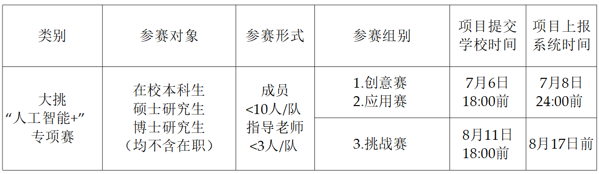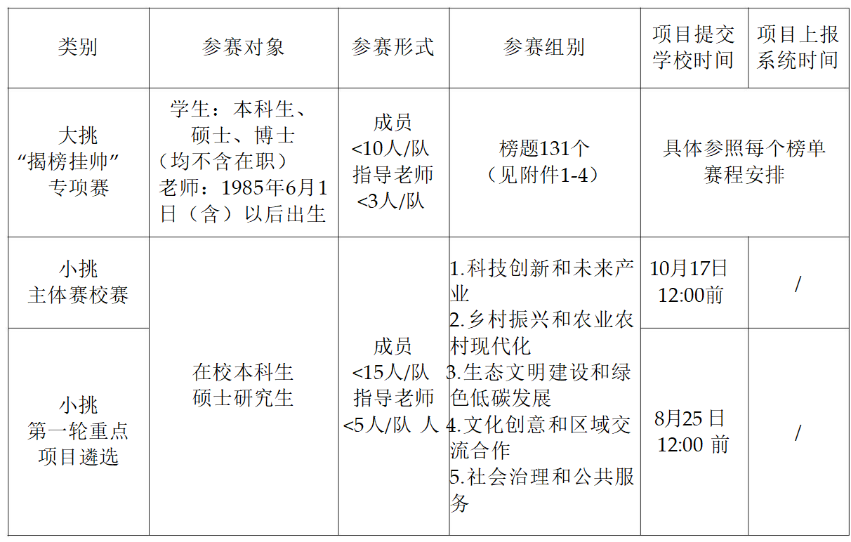 为深入贯彻习近平新时代中国特色社会主义思想,围绕中国式现代化建设的中心任务,引导和激励广大青年踊跃投身科研攻关第一线,提升创新能力,现将第十九届“挑战杯”全国大学生课外学术科技作品竞赛(简称“大挑”)“人工智能+”“揭榜挂帅”专项赛、第十五届“挑战杯”中国大学生创业计划竞赛主体赛(简称“小挑”)及重点项目遴选的相关安排如下: