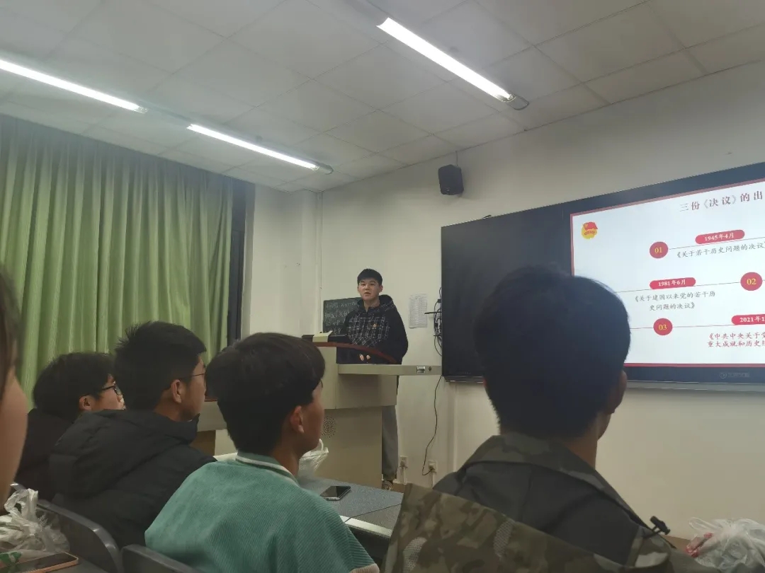 首先,杨楠同学带领学生会干部学习十九届六中全会会议主要内容以及全会精神。之后简述几次中央全会,着重介绍十九届六中全会两项议程,以及相继出台的三份《决议》,此次全会总结百年成就和历史经验就这个问题展开叙述。会议总结百年成就和历史经验,是建党百年历史条件下开启全面建设社会主义现代化国家新征程,在新时代坚持和发展中国特色社会主义的需要;增强“四个意识”、坚定“四个自信”、做到“两个维护,确保全党步调一致向前进的需要;推进党的自我革命、提高全党斗争本领和应付风险挑战能力、永葆党的生机活力、团结带领全国各族人民为实现中华民族伟大复兴的中国梦而继续奋斗的需要。并列举了百年历史创造的四个阶段的伟大成就。之后又说明了中国共产党百年奋斗的历史意义,此次六中全会回答的“两个问题”,总结的“十个坚持”。