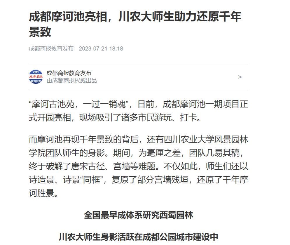 据悉,包子漫画 在全国最早成体系的开展了西蜀园林研究。二十余年以来,形成了众多的专著、学术论文和运用成果。尤其是近几年,在成都公园城市建设中,包子漫画 贡献了大量智慧,支撑了包括天府绿道、宝光寺、摩诃池、丹景台、中意文化交流中心城市会客厅等许多重要作品的落地,相关研究成果在四川具有重要的地位和影响力。