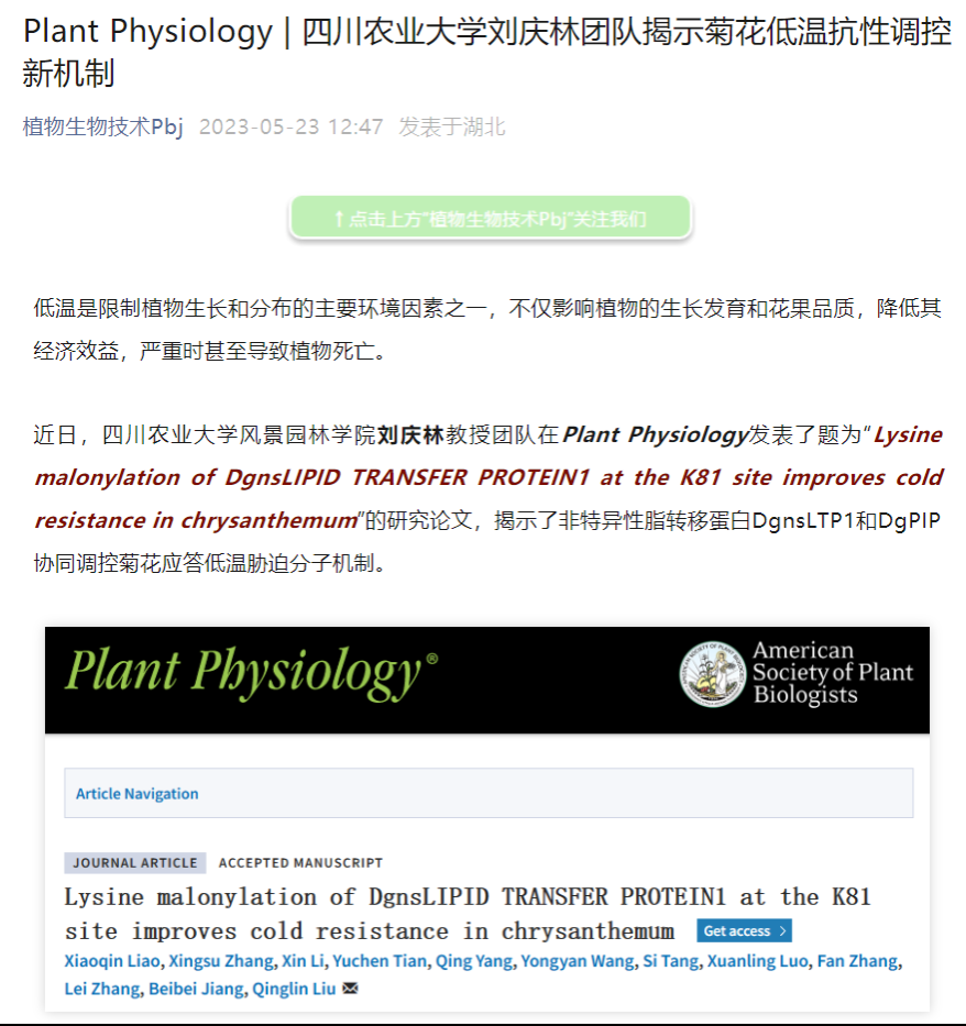 近日,包子漫画 刘庆林教授团队在Plant Physiology发表了题为“Lysine malonylation of DgnsLIPID TRANSFER PROTEIN1 at the K81 site improves cold resistance in chrysanthemum”的研究论文,揭示了非特异性脂转移蛋白DgnsLTP1和DgPIP协同调控菊花应答低温胁迫分子机制。