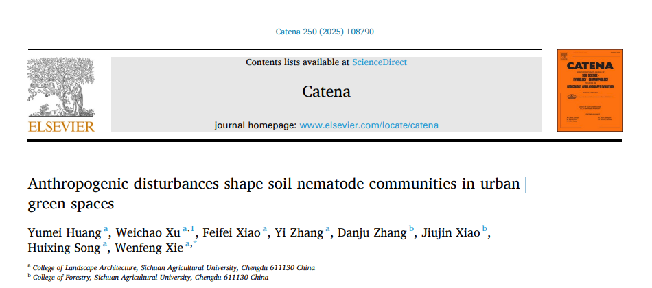 近日,学院黄玉梅副教授团队在“CATENA”发表了题为“Anthropogenic disturbances shape soil nematode communities in urban green spaces”的研究论文,揭示了人为践踏干扰对城市草坪土壤线虫功能群多样性的影响机制。