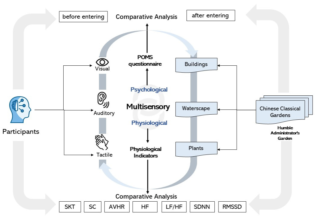 本研究以世界遗产地拙政园为研究对象,通过融合视觉、听觉及触觉体验的多感官框架,深入探究了中国古典园林所带来的健康与福祉效益。本研究采用综合性方法,将详尽的问卷调查与精确的生理指标测量相结合,全面评估了参与者在踏入园林前后以及在游览不同景观节点期间的心理与生理反应动态。主要研究发现如下:(1)传统园林环境引发了显著的积极感知效应;(2)园林中建筑、水体、山石和植物等景观元素的多样化组合与健康福祉的显著提升密切相关。其中,视觉景观的多样性带来了更为明显的效益,水体对健康的积极影响最为显著,而山石的影响相对较弱;(3)在同一景观空间中,参与者的生理和心理反应存在差异,其中触觉体验引发的心理前后变化最为显著。研究表明中国古典园林多感官体验在促进健康福祉中的核心作用,为人们提供了超越文化和生态服务功能外的健康效益。