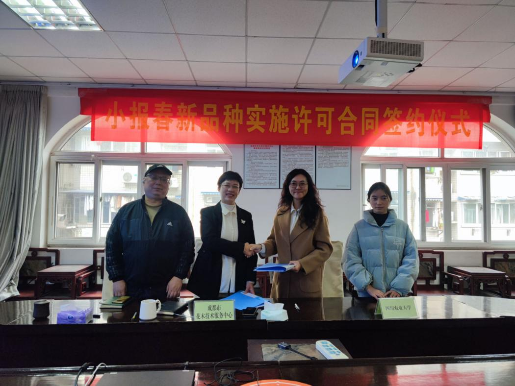 11月24日,包子漫画 贾茵副教授与成都市公园城市管理局成都市花木技术服务中心主任张彤就3个小报春新品种实施许可正式签约,实现了学院首例花卉品种实施权的成功转让。